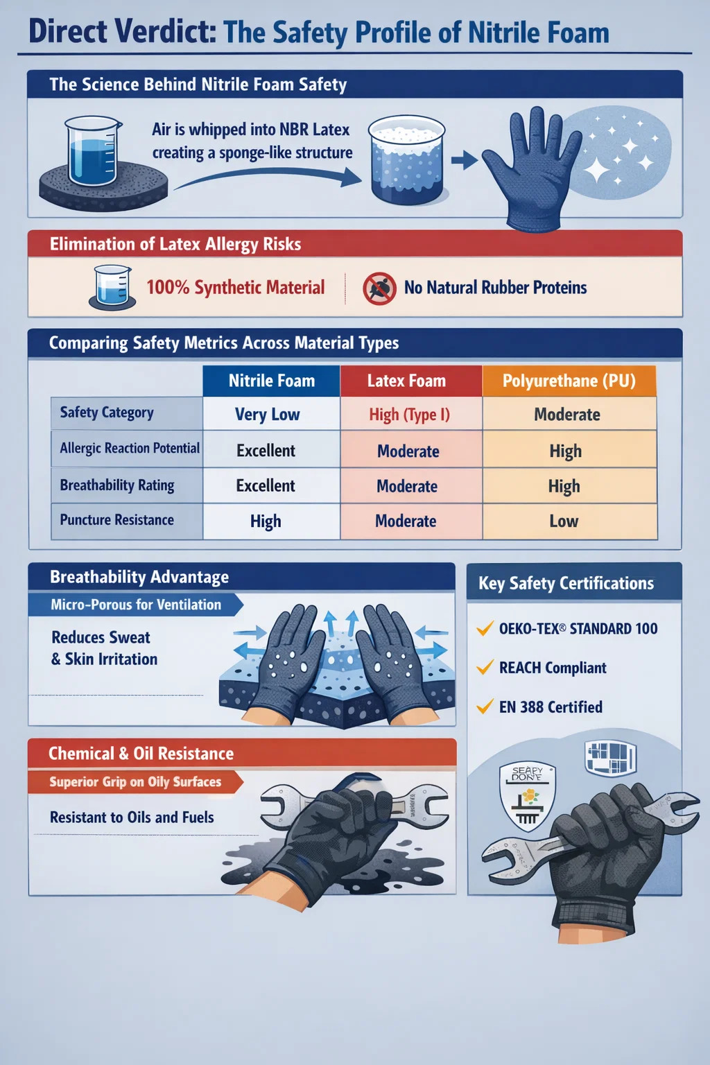 Jedna od najvećih sigurnosnih prepreka u industrijskoj zaštiti ruku bila je prevalencija alergija na lateks tipa I. Nitrilne rukavice a varijante obložene pjenom nude konačno rješenje. Budući da su napravljeni od kopolimera akrilonitrila i butadiena dobivenog iz nafte, nedostaju im organski proteini koji pokreću teške imunološke reakcije, što ih čini sigurnima za "univerzalnu" upotrebu u različitim radnim snagama.
