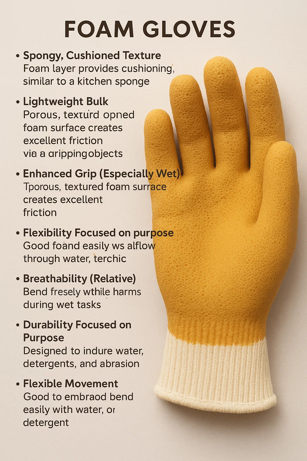 Većina pjenastih rukavica za čišćenje ima podstavu od tkanine (pamuk, poliester) za udobnost na koži, umočenu u pjenasti lateks ili PVC.