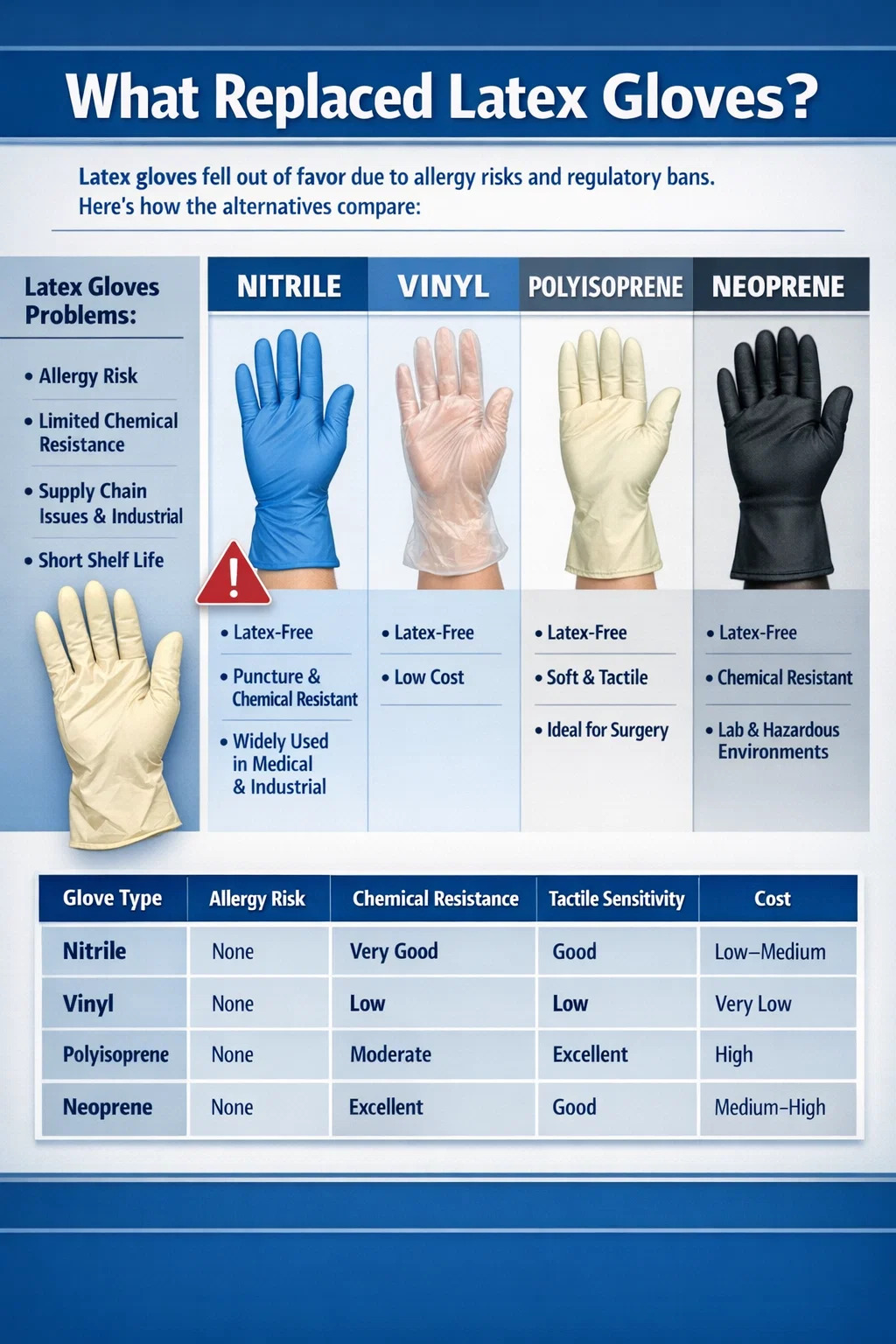 Ako tražite izravan odgovor, nitrilne rukavice danas su dominantna zamjena za rukavice od lateksa u većini industrija. Bilo u bolnicama, stomatološkim klinikama, pogonima za preradu hrane ili automobilskim radionicama, nitril je pretekao lateks kao materijal za rukavice. Taj se pomak počeo ubrzavati 1990-ih kada su se stope alergije na lateks među zdravstvenim radnicima popele na alarmantne razine - neka su istraživanja pokazala da su stope senzibilizacije visoke kao 17% među redovito izloženim medicinskim radnicima . Od tada su proizvođači, regulatori i timovi za nabavu sve više favorizirali alternative bez lateksa.